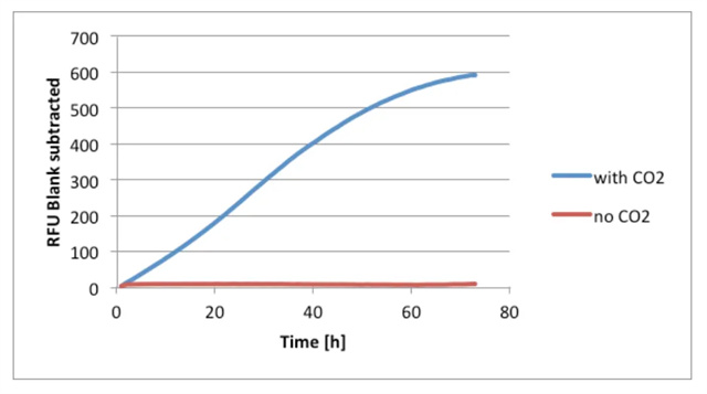 在測量室中保持溫度為37℃,CO2濃度為5%,用Varisikan Lux儀器每小時測一次熒光(激發(fā)波長560nm,發(fā)射波長590nm,底讀),測72小時。 同時進行未控制CO2水平的實驗作為對照。
